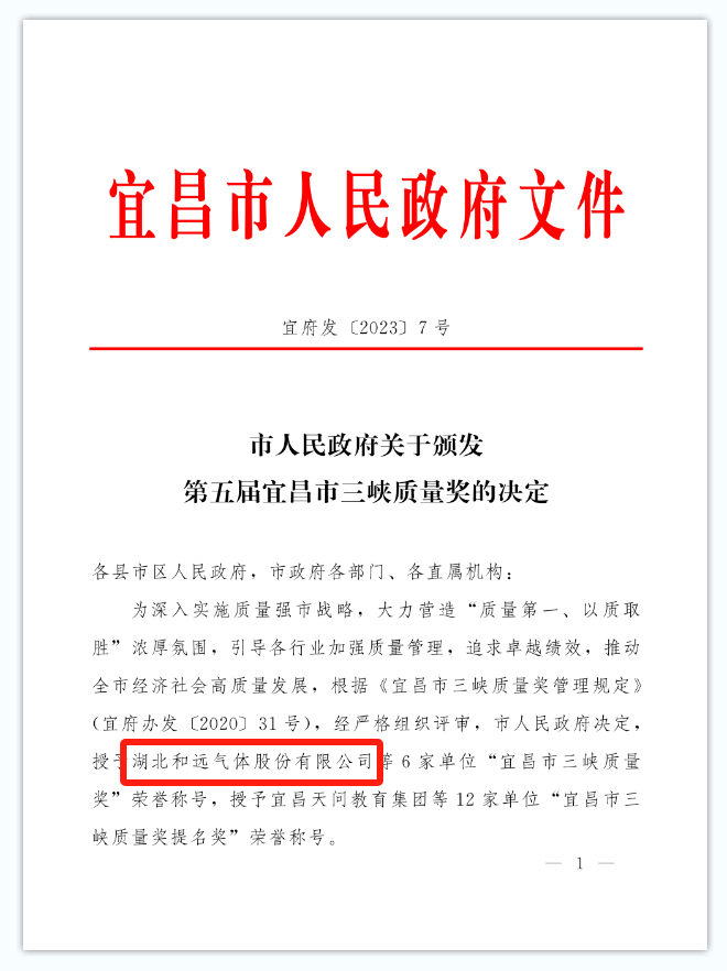 喜報!和遠氣體榮獲第五屆“宜昌市三峽質(zhì)量獎”